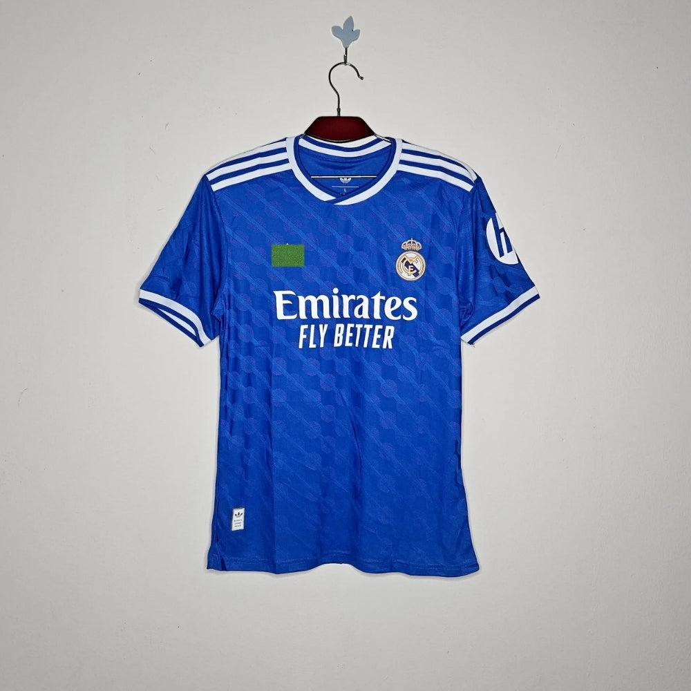 Introducing the Real Madrid 25/26 Third Kit, a remarkable combination of tradition, innovation, and distinctive Bernabéu spirit. This Real Madrid Blue Jersey 2025, with a bold blue base and sharp white accents, isinspired by the new seating inside the Santiago Bernabéu, a forceful statement to the club’s future while honoring its rich history.
